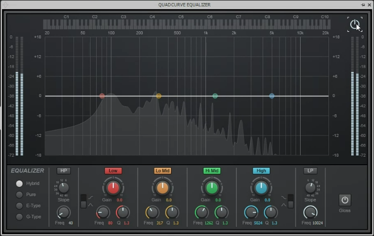 - Peak : 선택된 주파수를 중심으로 Q 컨트롤러에 따라 좌우 대칭으로 Gain 컨트롤러만큼 수정
