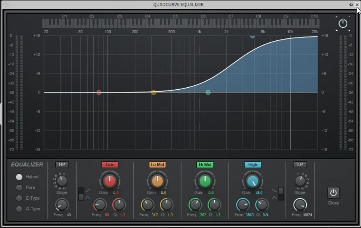 - Hi/Low-Shelf : 선택된 주파수를 기준으로 Hi-Shelf일 경우 고주파를 Gain 컨트롤러만큼 조절,